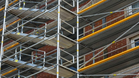 Stepenište za montažu i demontažuStepenište za montažu i demontažu do- pušta izvedbu kompaktnih pristupa u unutrašnjosti građevinskih objekata s malim stepenišnim otvorima. Pritom se kraći horizontalni profili priključuju pod kutem od 90° na istoj visini te primjenjuju stepenice s manjim dužinama i visinama prolaza. Stepenište za montažu i demontažu istovremeno služi kao radni podest za obradu zidnih strana. Pomoću standardnih komponenti mogu se realizirati pristupi u visinskim koracima od 25 cm. Skela nudi fleksibilnost za privremene radove na viso- ko pozicioniranim radnim mjestima kod specijalnih tlocrta, a kratke stepenice širine 75 cm maksimiraju prilagodljivost za manje prostore i uske geometrije.