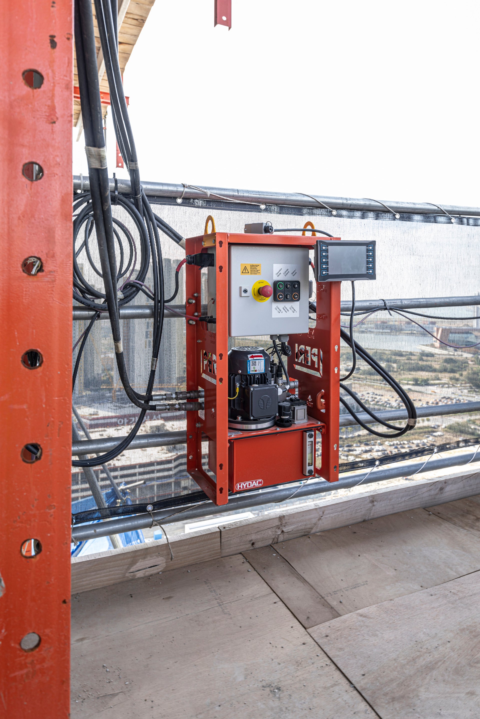 Hidraulički cilindri omogućuju penjanje podesta u koracima od 750 mm. Zahvaljujući reduciranim taktovima cilindara potrebno je manje koraka za pozicioniranje u sljedeći radni odsječak. Kratka i čvrsto postavljena crijeva osiguravaju manji gubitak pritiska tijekom penjanja pa je fokus samo na stvarno potrebnom učinku. Time se sistem učinkovitije koristi.